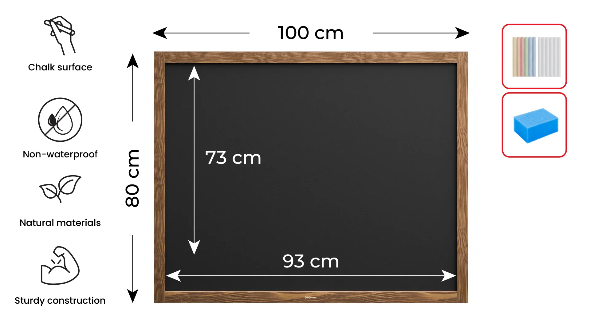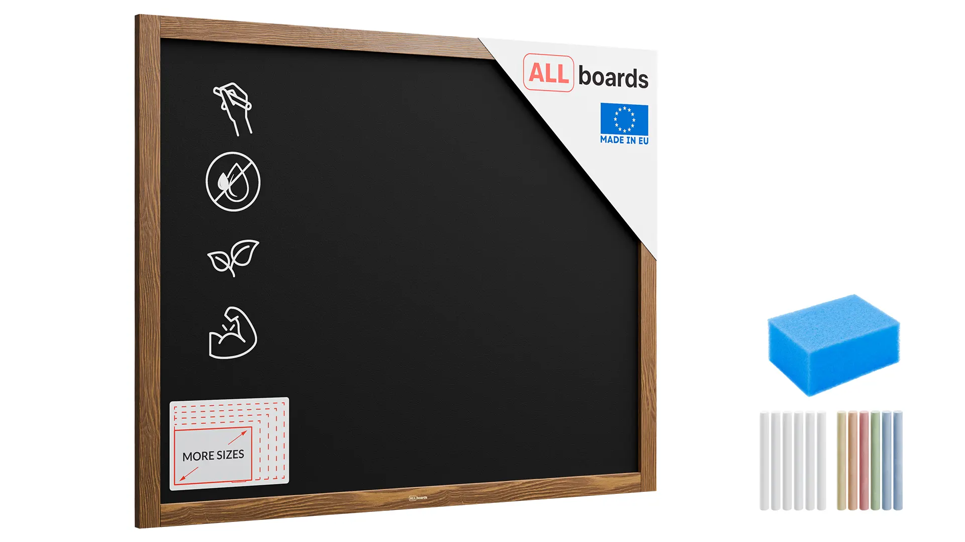 The high quality board surface is made of high-density HDF fibreboard and is overlayed with black varnish, which ensures the right contrast and prevents the chalk dust from penetrating the surface. Chalk markers can also be easily wiped off with a damp cloth or sponge. The blackboard surface is scratch-resistant. Suitable for writing on with chalk or chalk markers.