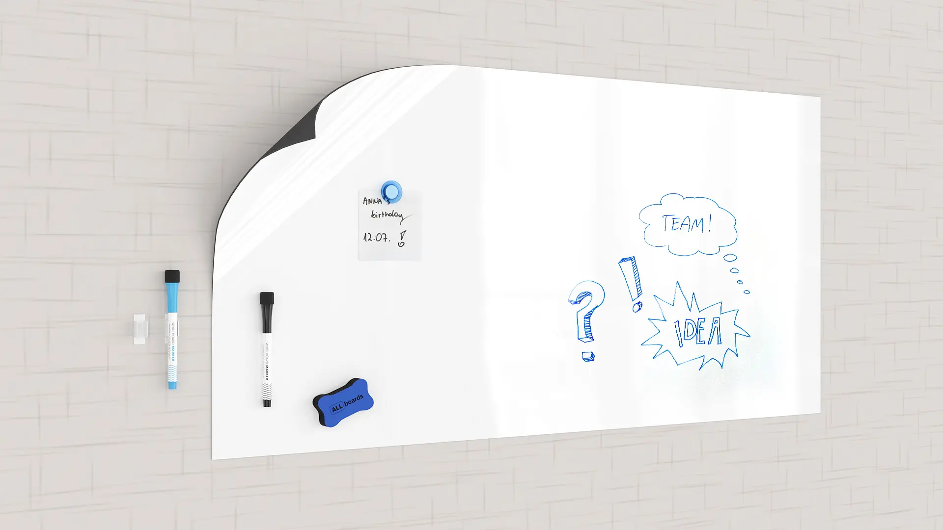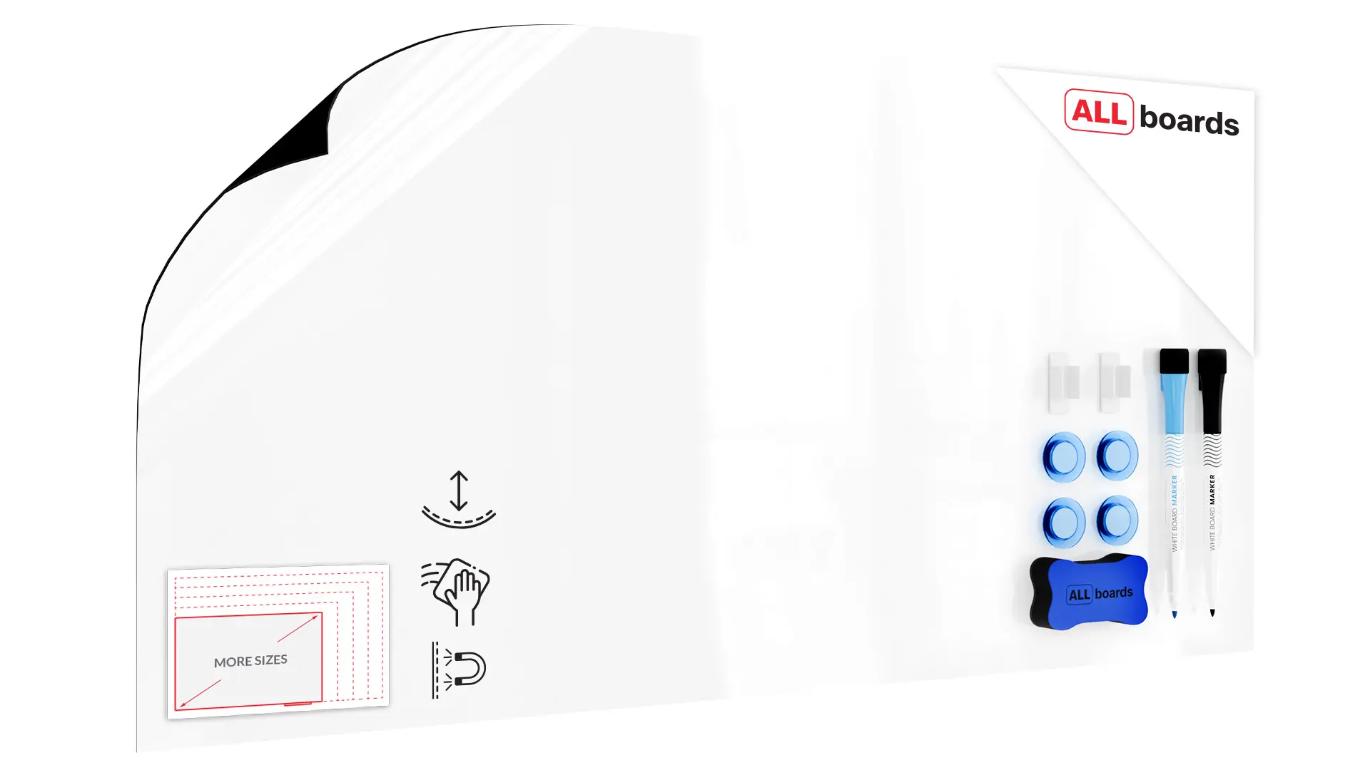 The ALLboards self-adhesive dry-erase overlay is an ultra-thin whiteboard for your notes, featuring an adhesive backing that makes it easy to attach to your chosen surface — quickly, effortlessly, and without drilling!